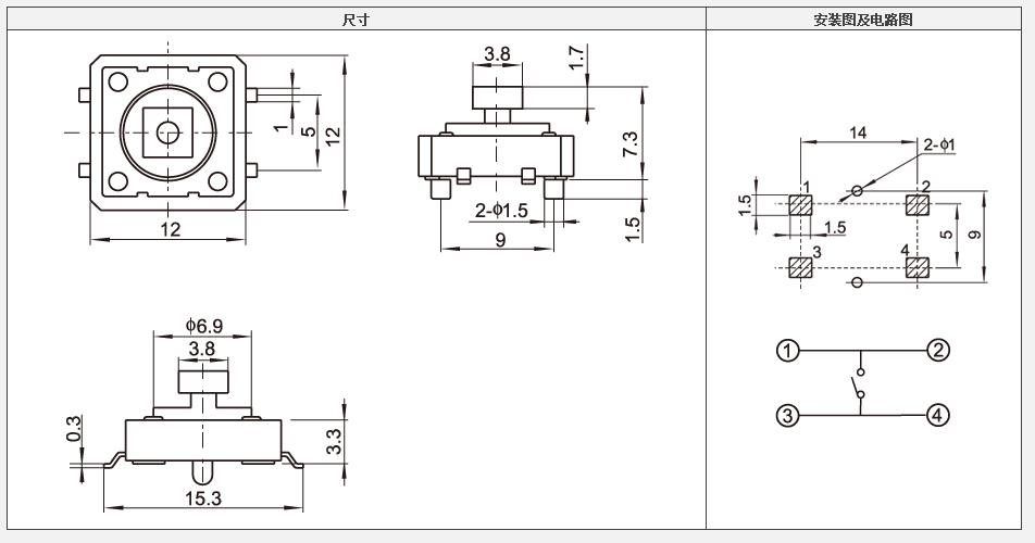 12*12贴片轻触开关_方头轻触开关_12*12方头轻触开关厂家,因为尺寸为:长12mm宽12mm,因此称作12*12轻触开关。包含带定位柱、不带定位柱、柄的形状分为:圆柄和方柄,力度分为:150g、180g、250g、300g、400g等