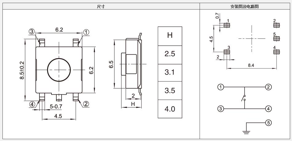 贴片6.2*6.2 5脚轻触开关,6.2*6.2贴片轻触开关厂家规格书: