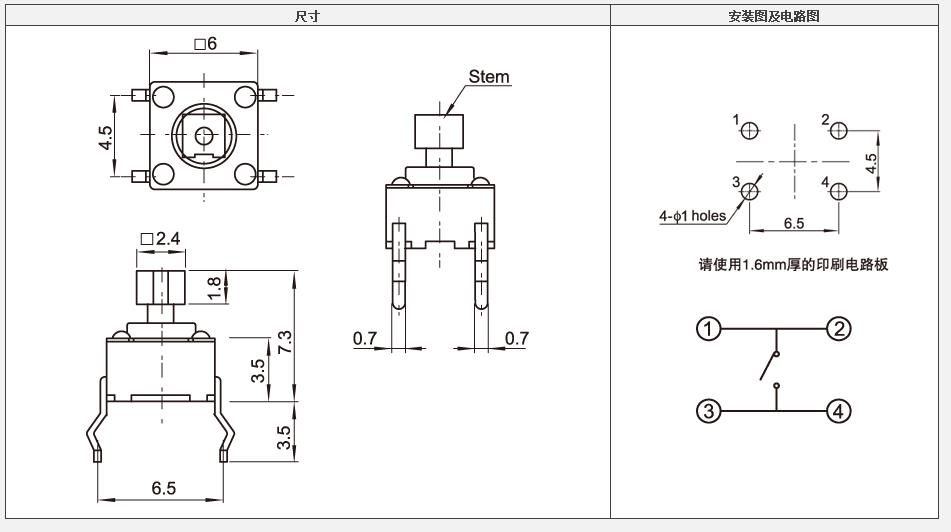 6*6方头轻触开关,6*6方头按键开关,6*6方头插件贴片轻触开关厂家规格书: